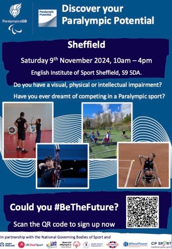 The event is called the ‘Discover Your Paralympic Potential Day’. It’s taking place on Saturday 9th November 2024 @ English Institute of Sport Sheffield, Coleridge Rd, Sheffield, S9 5DA from 10am – 4pm.